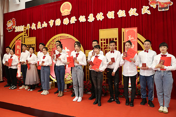 图四、3月12日,8对新婚夫妇在武夷山市民政局结婚颁证仪式上亮结婚证书 。