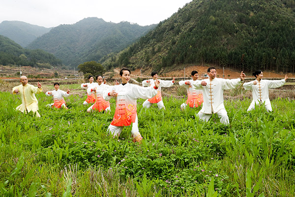 图二、3月14日,健身爱好者在武夷山吴屯乡街路村百花岩自然村表演健身气功八段锦。