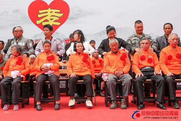 10月25日(农历9月初9)在武夷山市兴田镇西郊村“朱子孝道”文化节上儿女们走上台给父母捶背。